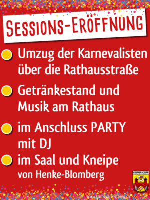 Nach der Eröffnungszeremonie zieht die Festgesellschaft – je nach Wetterlage früher oder später – weiter in die Gaststätte „Henke-Blomberg“ in der Rathausstraße 45, wo Kneipe und Saal für alle Närrinnen und Narren geöffnet sind. Hier sind alle Karnevals-Fans herzlich willkommen! Der Eintritt ist kostenlos, und für das leibliche Wohl ist ebenfalls gesorgt. Neben Bier, Longdrinks und Wein gibt es einen Grillstand, an dem Würstchen im Brötchen und Pommes serviert werden.