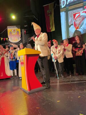 Doch das Highlight des Abends folgte noch: die Verleihung des Goldenen Tores. „Eigentlich denkt man immer, er hätte es schon längst“, leitete Präsident Hanhardt die Ehrung ein. Die höchste Auszeichnung der Grafschaftler ging in diesem Jahr an Thomas Meier, der seit Jahren als heißer Anwärter galt. Nun wurde ihm die verdiente Ehre zuteil. Der amtierende Elferratspräsident blickt auf eine jahrzehntelange karnevalistische Karriere zurück und ist für seinen unermüdlichen Einsatz im Verein bekannt.