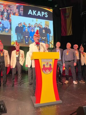 Eine ganz besondere Ehrung wurde anschließend einer Gruppe hochverdienter Karnevalisten zuteil: Die AKAPS wurden für ihr Lebenswerk mit dem neu geschaffenen Verdienstorden der Grafschaftler in Gold ausgezeichnet. In seiner Laudatio würdigte Gerd Muhle das jahrzehntelange, kreative und unermüdliche Wirken dieser außergewöhnlichen Truppe im Rietberger Karneval.