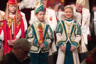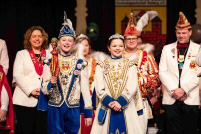 Einmal Prinz oder Prinzessin zu sein – dieser Traum kann in unserer Gesellschaft schon für die Kinder in Erfüllung gehen! Meist sind es Schüler und Schülerinnen der dritten Grundschulklasse, die dieses Amt bei uns bekleiden dürfen. Wie bei den Erwachsenen heißt es: Geheimhaltung ist oberste Pflicht denn auch bei den Kindern wird erst bei der Proklamation in der Kindersitzung bekannt, wer die neuen Tollitäten sind. Dann gibt es aber kein Halten mehr und unsere kleinen Regenten dürfen richtig durchstarten: Bei Terminen in der Schule, dem Kindergarten oder dem Altenheim repräsentieren sie unseren Verein. Am großen Höhepunkt der Session, dem Rosenmontag haben die Kinder ein besonderes Privileg: Sie dürfen zweimal mit ihrem eigens gebauten Wagen durch die Stadt fahren und Kamelle verteilen: Vormittags beim Kinderumzug und nachmittags beim großen Rosenmontagsumzug.