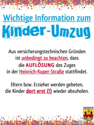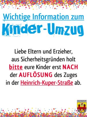 Die Zugauflösung des Kinderumzuges findet in der Heinrich Kuper Straße statt. Die Kinder sollen erst nach der Zugauflösung aus dem Umzug abgeholt werden.