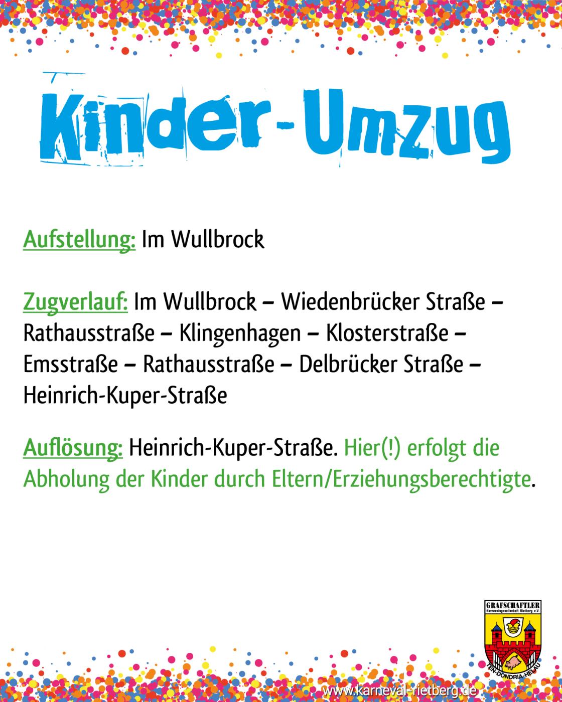 Wichtige Information: Der Kinderumzug beginnt im Wullbrock und endet in der Heinrich-Kuper-Straße. Details findet ihr in den Bildern.