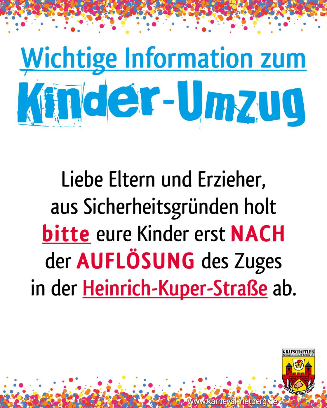 Die Zugauflösung des Kinderumzuges findet in der Heinrich Kuper Straße statt. Die Kinder sollen erst nach der Zugauflösung aus dem Umzug abgeholt werden.